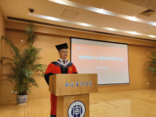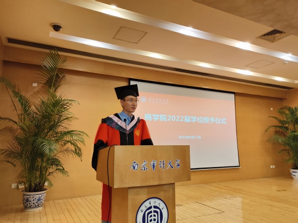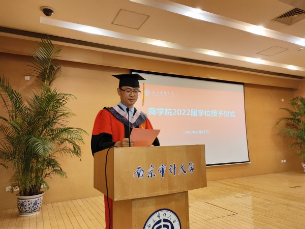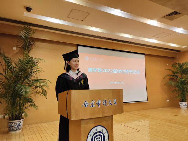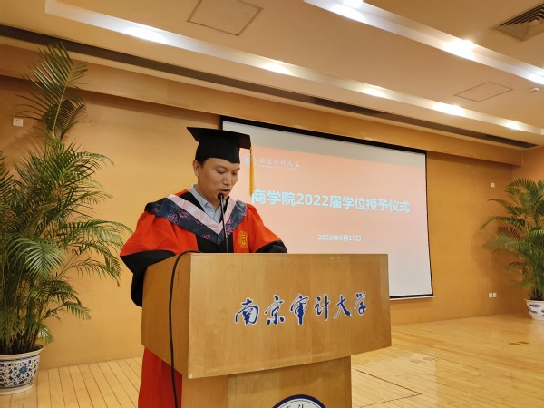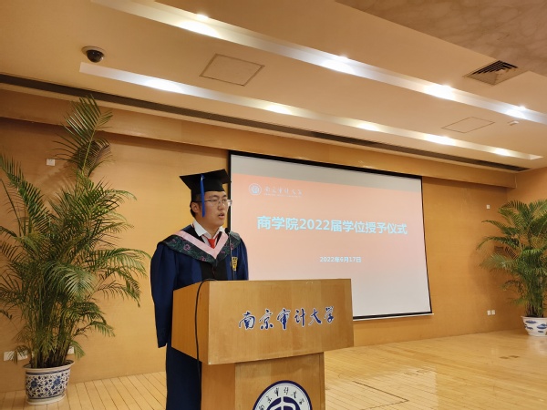 优秀研究生代表、考取南京大学博士研究生的潘天行同学,优秀本科生代表、考取中央财经大学硕士研究生的周倞伊同学先后发言。两位同学首先代表太阳成集团122ccvip2022届全体毕业生向培养我们的母校、向教导我们的师长,表达了最真挚的感谢。桃花潭水深千尺,不及南审同窗情;东西南北风常在,唯有师恩留心间。在发言中,他们回顾了在校3年、4年间公司和太阳成集团122ccvip的发展变化,见证了太阳成集团122ccvip工商管理与物流管理两个专业成为国家级一流本科专业建设点的辉煌。最后庄严表示,将不忘最初的信仰,争做立大志、明大德、成大才、担大任的时代新人。