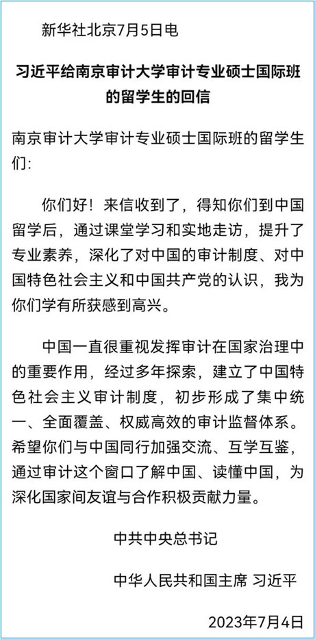 习近平在回信中说,得知你们到中国留学后,通过课堂学习和实地走访,提升了专业素养,深化了对中国的审计制度、对中国特色社会主义和中国共产党的认识,我为你们学有所获感到高兴。