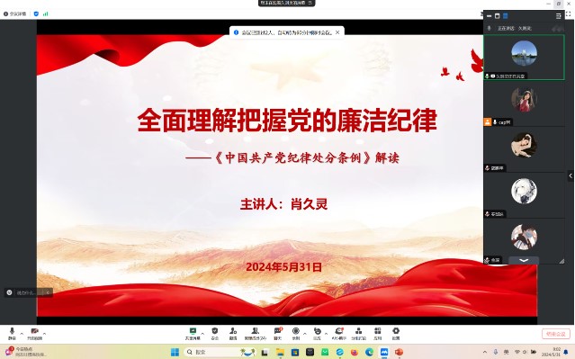 在中国共产党的坚强领导下,为了进一步加强党员的纪律意识,提高遵守党纪的自觉性,太阳成集团122ccvip研究生党支部于5月31日上午通过线上腾讯会议成功举办了《中国共产党纪律处分条例》学习大会,特邀公司党委纪检委员、太阳成集团122ccvip副经理、副书记肖久灵主讲,主题为“全面理解把握党的廉洁纪律“,旨在深入学习党的纪律处分条例,强化党员的纪律观念。全体研究生党员参加会议。