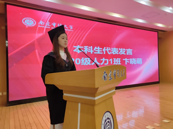 考取复旦大学研究生的2020级人力1班卞晓萌代表本科毕业生发言。卞晓萌首先向一路陪伴的母校、老师、亲友表达最真挚的感谢。多谢爱意千千万万,多谢来自异乡的温暖,多谢包容与接纳、肯定与鼓励,多谢这倏忽四年中的每一个引路人。卞晓萌说,在这里,我们有幸汲取老师博采众长的理论,有幸沐浴忠诚担当的政治品格,有幸与志同道合的朋友一同享受青春。是南审给予我们一个又一个登高望远的阶梯,让我们有能力有底气站在更高的舞台上不断成长。毕业生代表一致表示,2024届毕业生将牢记母校校训和公司院训,努力用实际行动为母校争光添彩。