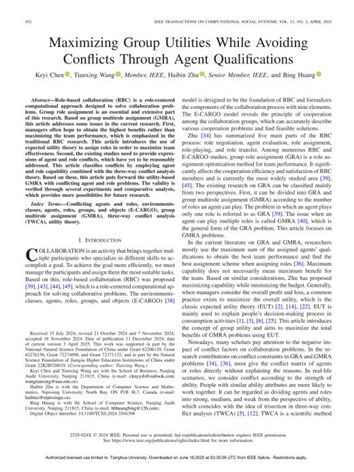 大数据管理与应用系2021级本科生陈柯熠在本科生导师王天行副教授的指导下,以第一作者身份在计算机控制论与信息系统领域期刊《IEEE TRANSACTIONS ON COMPUTATIONAL SOCIAL SYSTEMS》上发表了题为《Maximizing Group Utilities While Avoiding Conflicts Through Agent Qualifications》的研究长文(全文Article)。该论文创新性地提出了一种名为“效用驱动的群体多角色分配冲突规避模型”(Utility-based Group Multi-Role Assignment with Conflicting Agents and Roles, UGMAC),成功解决了复杂协作系统中在最大化团队整体效用的同时有效规避智能体(Agent)与角色(Role)间冲突的关键难题。